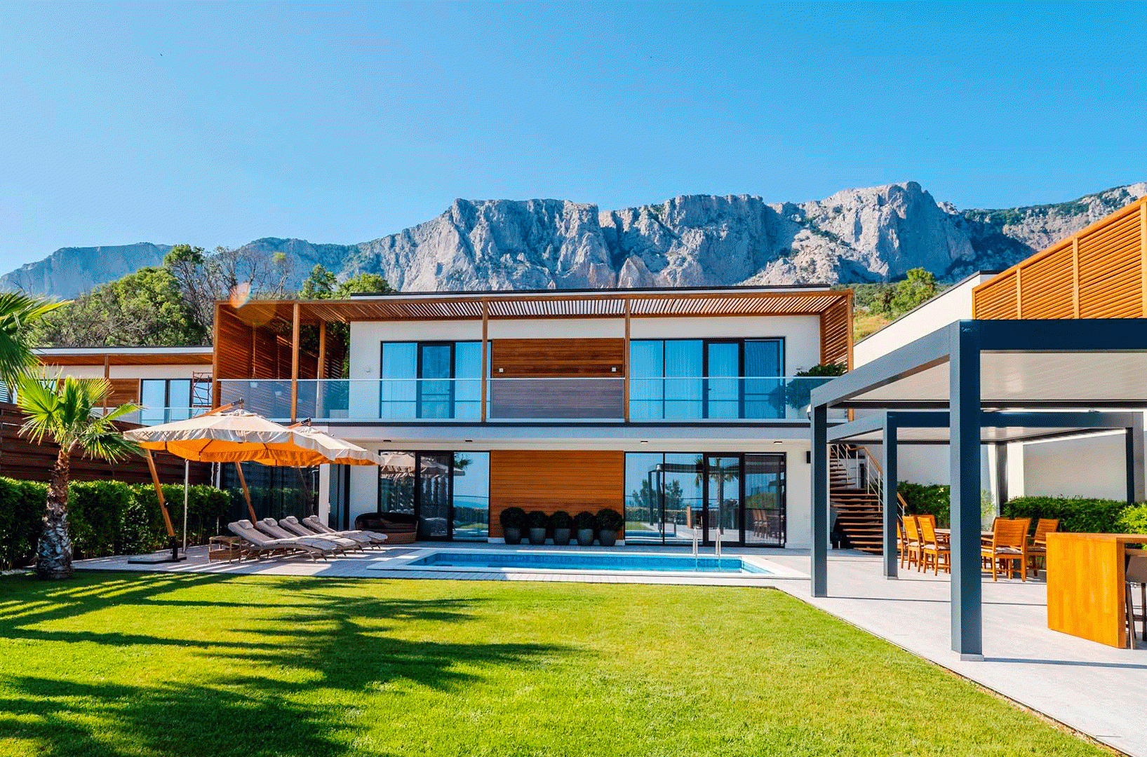 Виллы выполнены в пуристическом стиле Ле Корбюзье — чистота форм, простота и уют без лишних деталей. Современная минималистичная архитектура гармонично вписана в пейзажи Ялты, не отвлекая от красоты Черного моря. В домах установлены окна Schuco с высокой теплоизоляцией и экономией энергии.